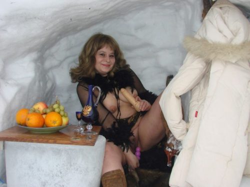 Деревенская баба позирует голая в сугробе