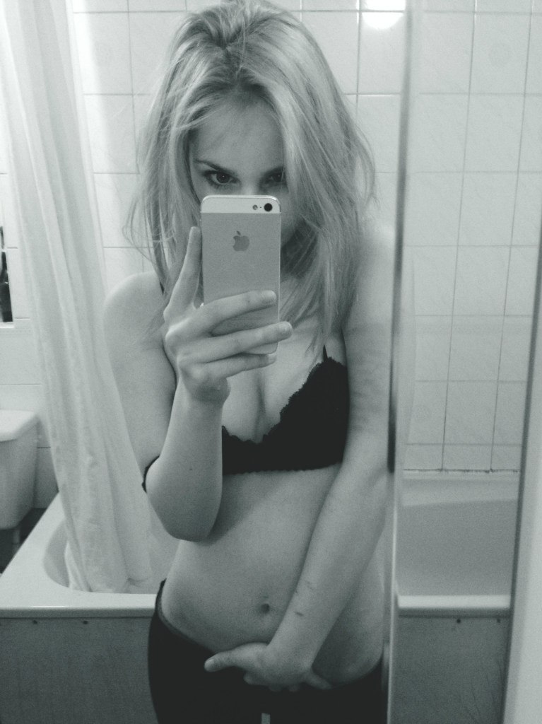 Молодая худышка с милым личиком делает дома эротические селфи. Блондинка показывает большие титьки в лифчике крупным планом и виляет маленькой попкой. Девушка позирует в нижнем белье или колготках, стесняясь оголять грудь или писечку.