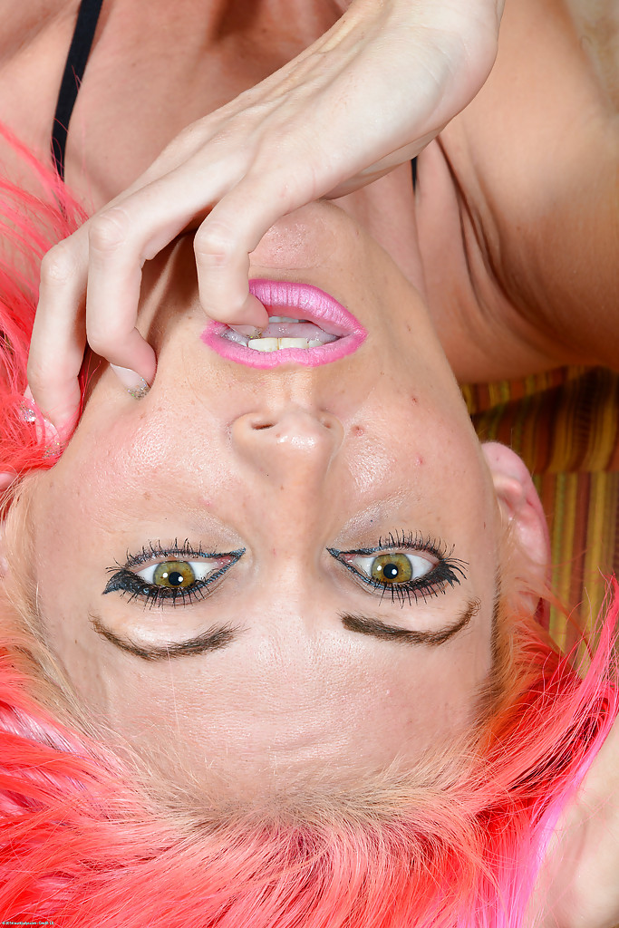 Стейси не зря выбрала розовый цвет волос. Она считает, что так выглядит более привлекательной. Деваха залезла на диван и начала снимать с себя одежду. Ее тело украшают разнообразные татуировки, за счет чего сучка кажется более доступной. Сняв с себя всю одежду телка ложиться на диван и раздвигает ноги. Она хочет прямо в камеру показать свою розовую киску.