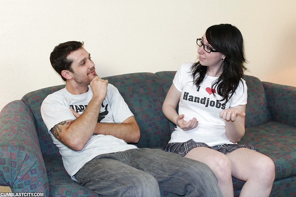 Молодая брюнетка в очках нашла себе молодого человека, который хочет заняться с ней сексом. Девка сказала, что она мастер по мастурбации и может побаловать парня своими нежными ручками. Чувак был абсолютно не против подобного секса, ему стало даже интересно. Девка сняла с чувака штаны и начала ласкать его конец. За считанные минуты с конца полилась сперма.