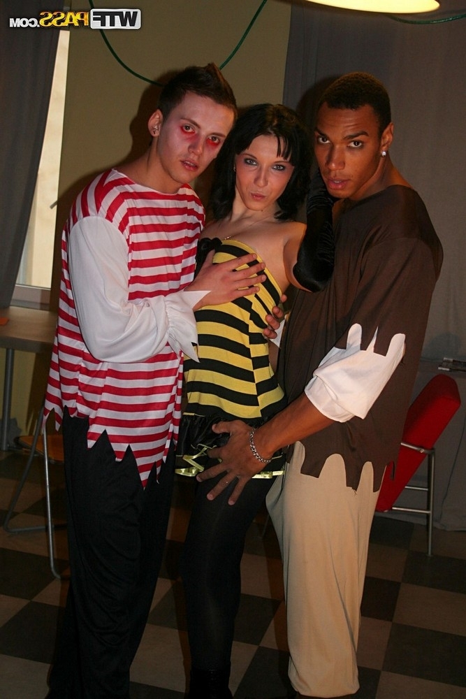 Трое парней неплохо развлеклись на Хеллуин, пригласив одну безотказную давалку, которая обслужила их всех. Девка игриво флиртовала с парнями и вскоре уже усердно трудилась с их членами во рту, которые со временем стали осваивать и другие расщелины в её блядском теле.