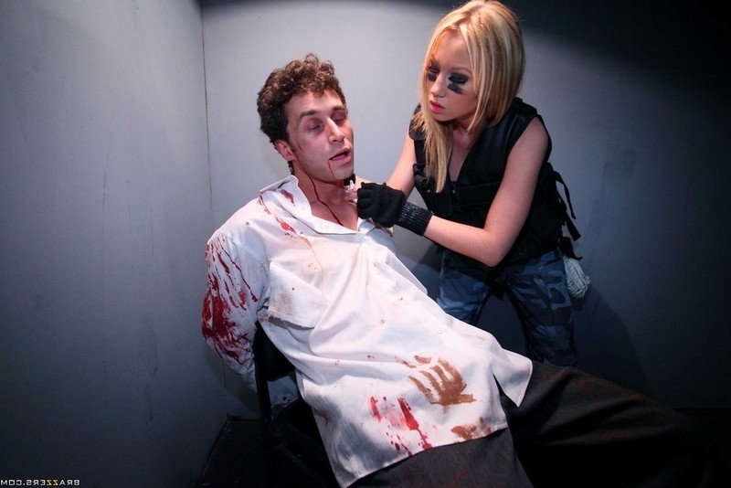 Сексапильная работница спецназа спасла заложника из лап похитителей и даже ублажила беднягу. Парень был рад увидеть её обнажённую грудь и принялся ласкать её, после чего белокурая милашка исполнила отменный минет, перед тем как вставить его стояк в свою влажную промежность.