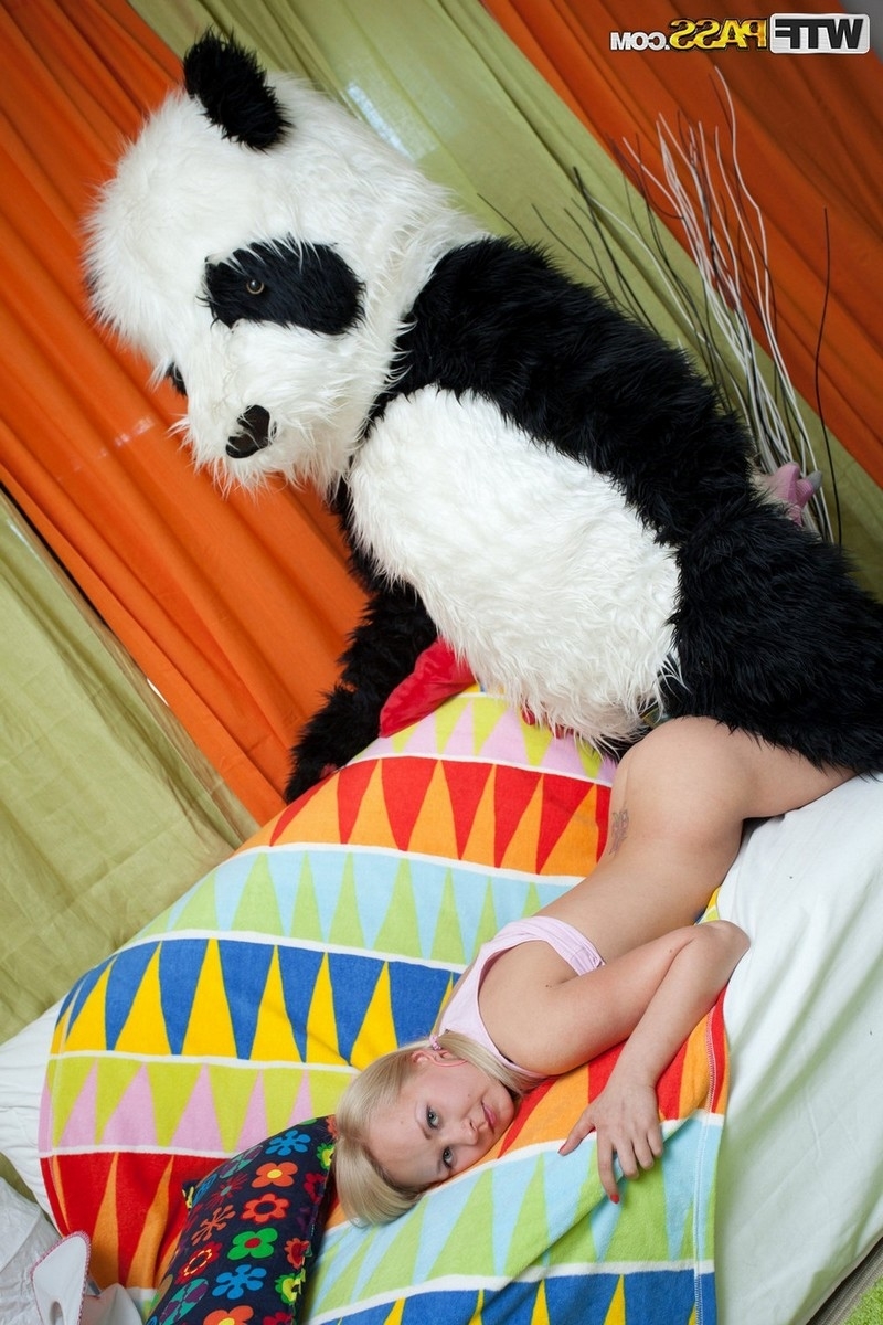 Миниатюрная соска забавляется со здоровый плюшевой пандой, к которой прикреплен самотык нехилых размеров. Мокрощёлка демонстративно берёт в ротик, показывая как хорошо она обучена минету и вставляет большой дилдо в свою разработанную щель, активно прыгая на нём.