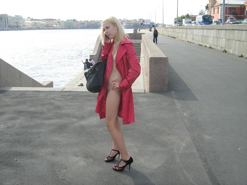 Худощавая блондинка вышла на прогулку в одном плаще на голое тело. Она добралась до набережной, где предпочла полностью раздеться, чтобы попозировать в обнаженном виде на фоне реки и городских строений. Блонда ничуть не стеснялась похотливых взглядов мужчин, ведь их внимание ей только льстило. Она снова накинула плащ на плечи и вернулась домой, довольная после прогулки.