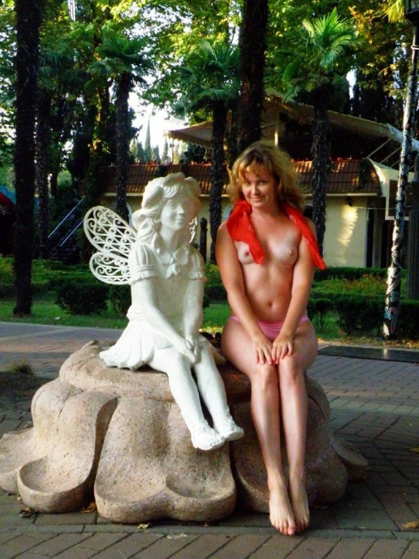 Стройная милашка приехала в отпуск к морю вместе с мужем. Веселый характер подталкивает ее на нетривиальные поступки. Озорница обнажается и позирует мужу на фоне скульптур, во время прогулки по базе, не стесняясь показывать небольшую, но сексуальную грудь. Купаться она предпочитает голой, демонстрируя аппетитные бедра и подтянутую задницу, прикрывая ручкой лишь лобок.