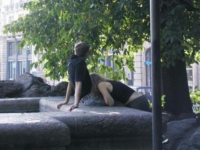 Смелые молодые люди совершенно не стесняются окружающих и занимаются сексом прямо на улице. Некоторые парочки трахаются в парке, другие устраиваются посреди оживленной улицы, привлекая взгляды прохожих. Лишь немногие собираются шалить на открытой местности, стараясь поменьше обращать на себя внимание и предаваться любовным утехам под прикрытием каких-либо конструкций.