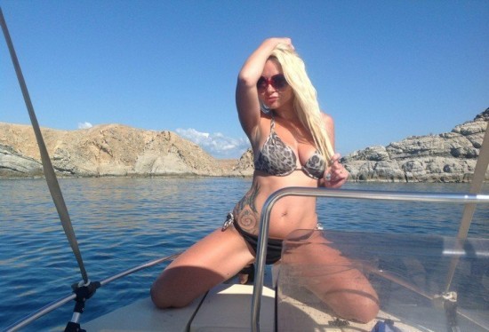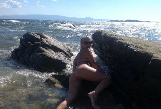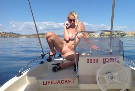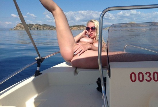 Блондинка начала откровенный фотосет на прибрежных камнях, где она стала раздеваться и демонстрировать свою великолепную грудь и кружевные трусики, после этого она перебралась на катер, который арендовал ее парень. Далее она раздвинула ножки, полностью оголилась и показала красивую промежность в различных позах, скрывая свои глазки под солнцезащитными очками.