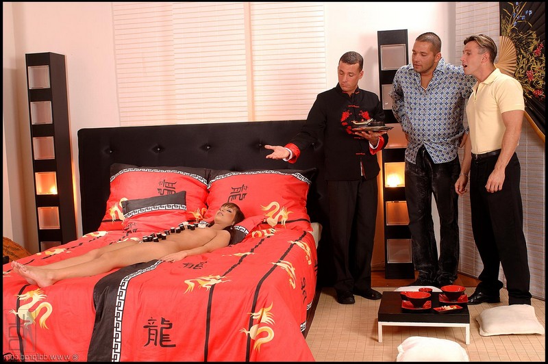 Мужик подготовил элитную соску к приходу трахарей, вставив ей анальную пробку и разложив на голое тело суши. Довольные мужики принялись драть горячую красотку, а вскоре и работника заведения пригласили присоединиться, что бы отодрать эту ненасытную нимфоманку втроём.