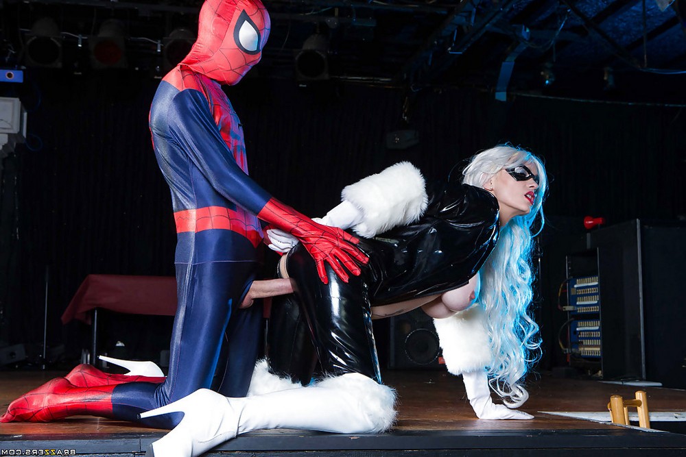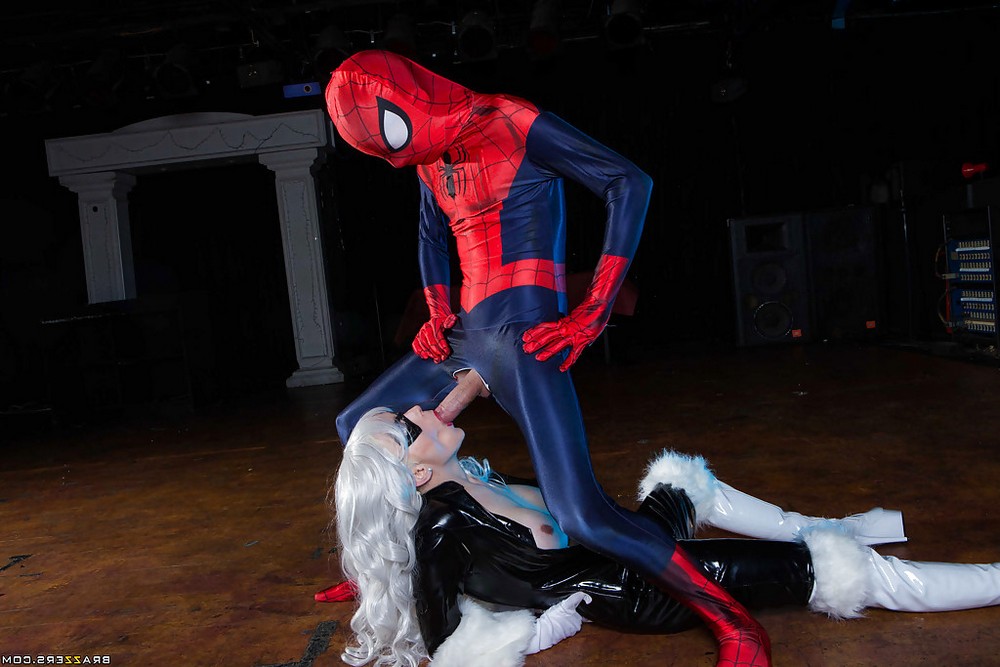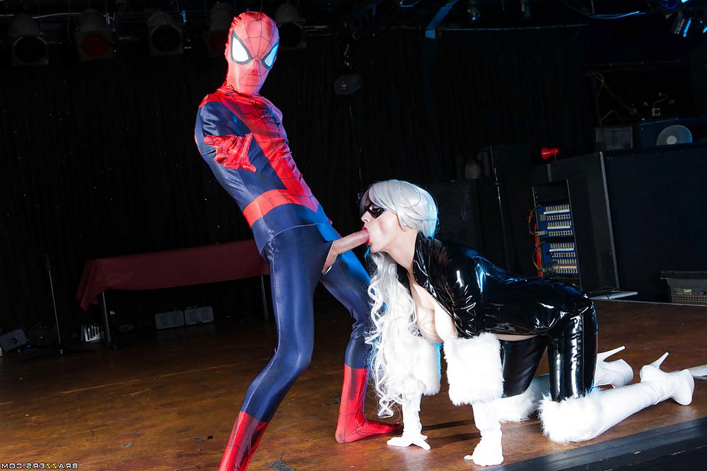 Человек-паук и Женщина-кошка в версии для взрослых займутся горячим сексом. Супергероиня с шикарными сиськами смачно отсасывает член Питера Паркера, после чего вставляет в свою влажную от женских соков киску и начинает стонать в такт его движениям внутри.