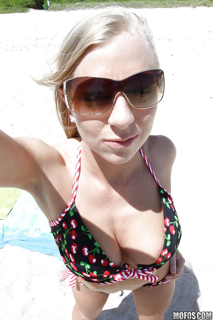 Девушка пришла на дикий пляж. Сняла джинсы и футболку, оставшись в купальнике с красными вишенками. Зашла в воду. Стеснительная блондинка ни на минуту не забывала всё это время о своём обещании показать сиськи и влагалище. И её это обстоятельство чрезвычайно угнетало. В итоге красотка согласилась показать только грудь. И плевать она хотела на всякие там дурацкие клятвы, данные ею по малодушию.